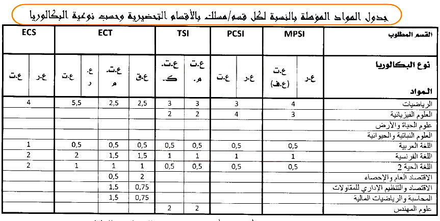 ثانيا: المواد المؤهلة ومعاملاتها حسب تخصصات الأقسام التحضيرية وشعب الباكالمواد المشار اليها تمثل فقط نقط المواد في الوطني (مثل الرياضيات- الفزياء- اللغة2-……) والجهوي (مثل العربية والفرنسية)