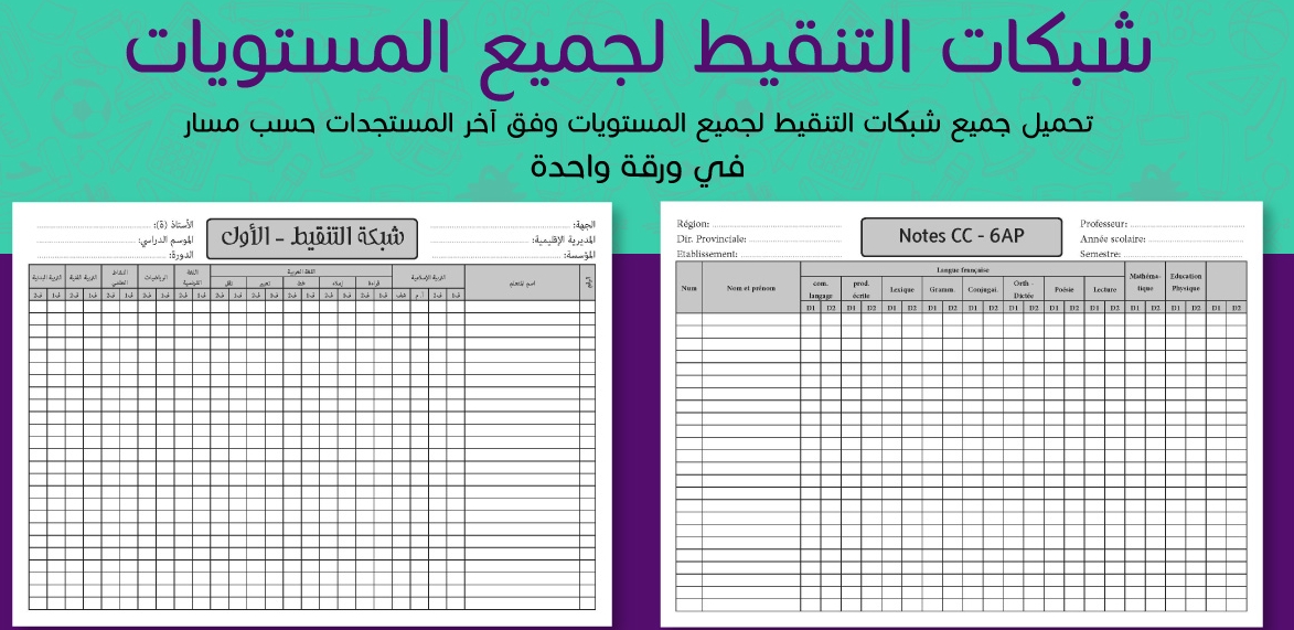 بسم الله الرحمان الرحیم، السلام عليكم ورحمة الله، إليکم شبكة تفريغ نقط المراقبة المستمرة لجميع المستويات التعليمية وفق تحديث مسار للموسم الدراس2021/2022 جاهزة للتحميل والطباعة،تعتبر شبكة تفريغ النقط وثيقة مهمة بالنسبة للسید الأستاذ والسيدة الأستاذة إذ تعتبر دفتر التنقيط يحتاجها لتسهیل عمل إدخال نقط فروض المراقبة المستمرة بمنظومة مسار ومن خلال هذا الموضوع نتقاسم معكم