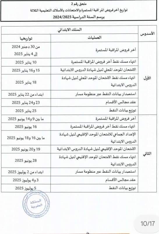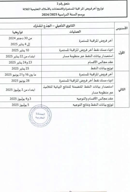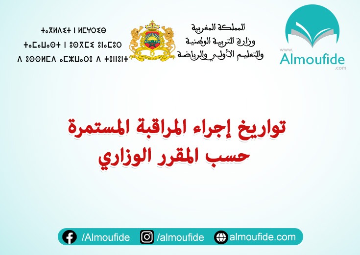 وفقًا لتعليمات وزارة التربية الوطنية، ستجرى فروض المراقبة المستمرة في مختلف مراحل التعليم بما في ذلك التعليم الابتدائي والتعليم الثانوي الإعدادي والتعليم الثانوي التأهيلي، بالإضافة إلى أقسام تحضير شهادة التقني العالي وأقسام الفرصة الثانية. يأتي هذا في إطار تقييم تقدم الطلاب ومساعدتهم في تحقيق نتائج إيجابية في مسيرتهم الدراسي