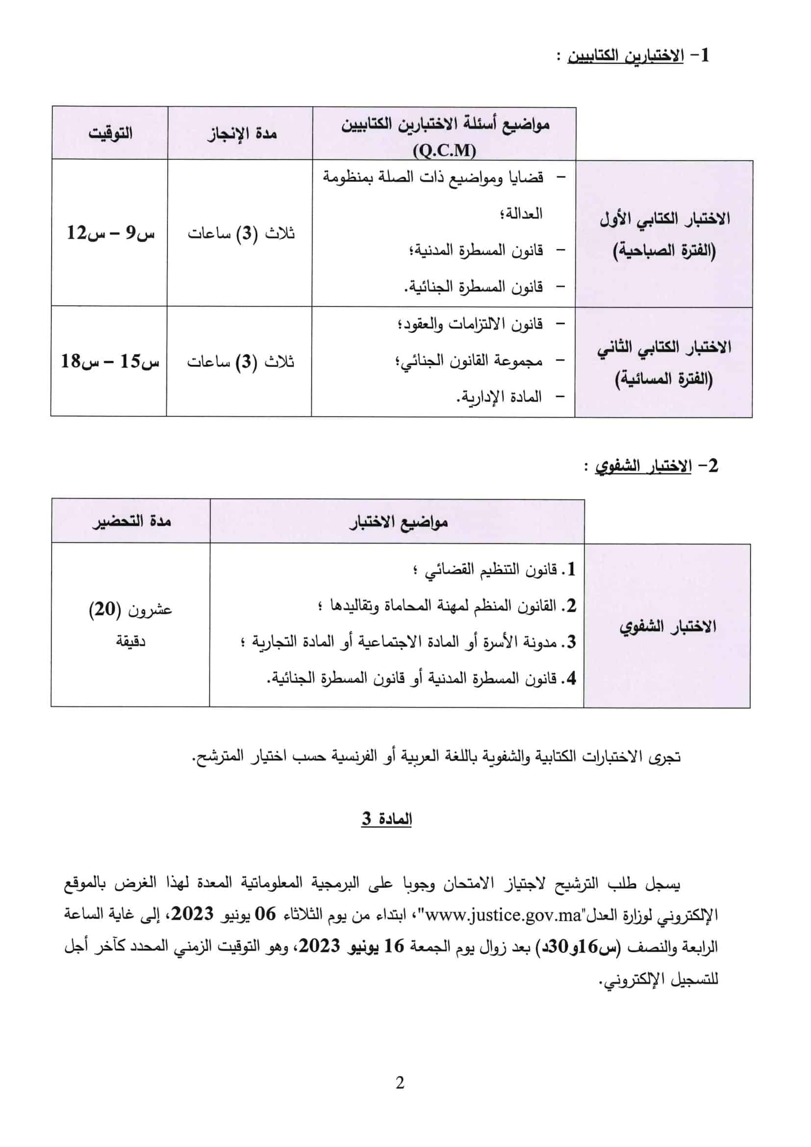 يجرى يوم الأحد 9 يوليوز 2023 بمدن الرباط، والدار البيضاء، فاس، طنجة، وجدة، مراكش، أكادير، بني ملال، الرشيدية، العيون، الاختباران الكتابيان للامتحان الخاص بمنح شهادة الأهلية لمزاولة مهنة المحاماة.