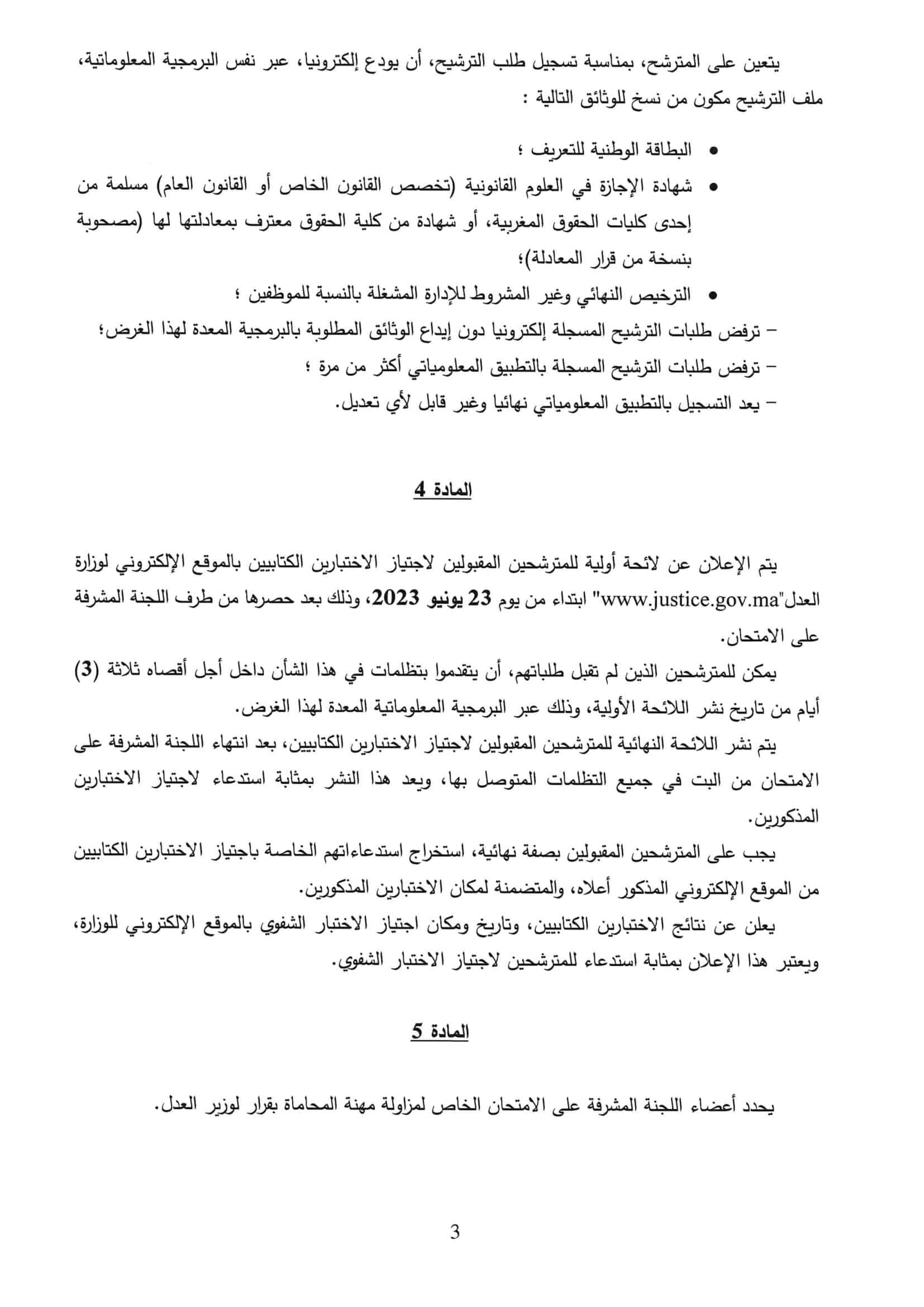 رسميا تم الاعلان عن امتحان جديد لمزاولة مهنة المحاماة 2023 (قرار وزير العدل) ولوج مهنة المحاماة التسجيل سينطلق ابتداء من يوم يوم 6 يونيو 2023 وسينتهي التسجيل يوم 16 يونيو 2023.