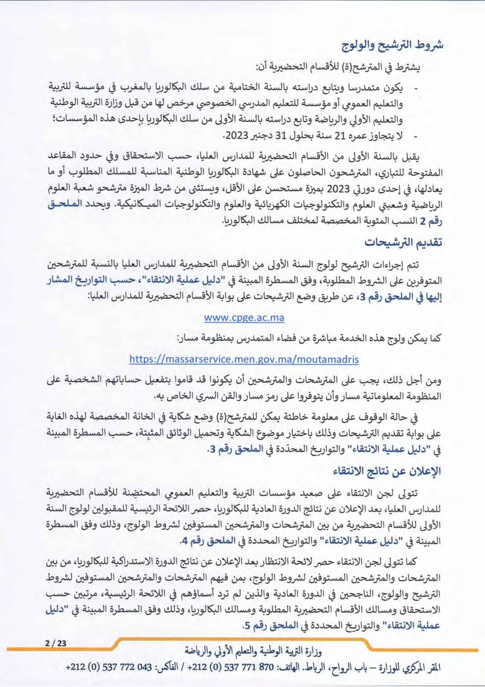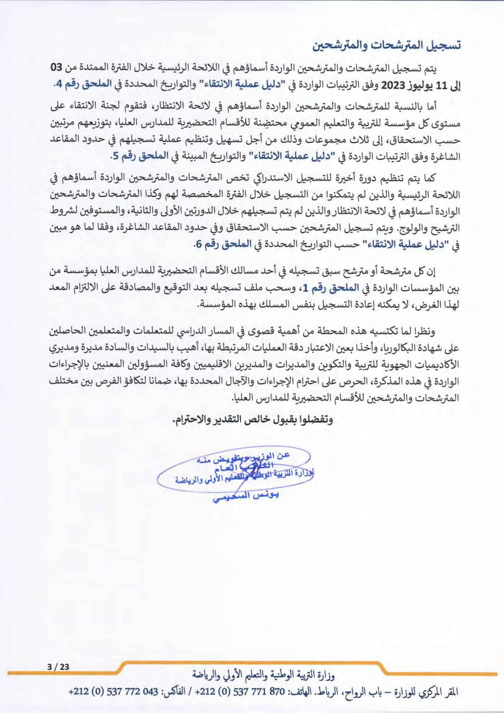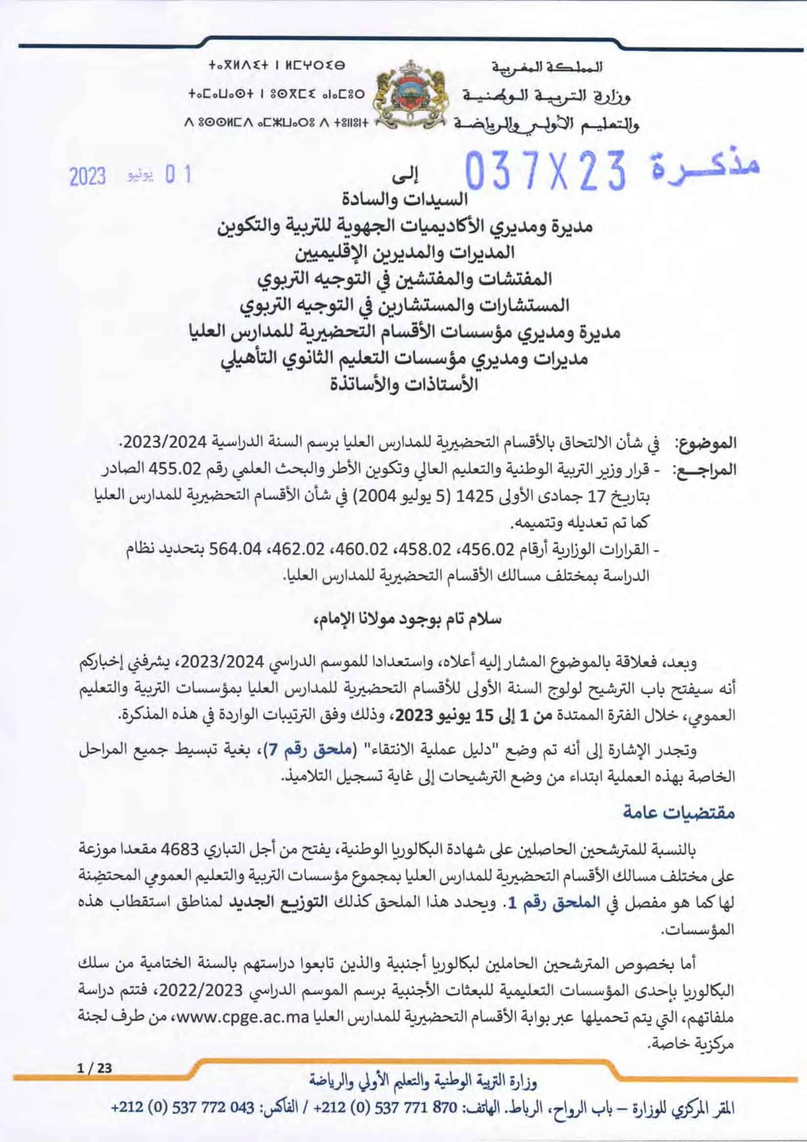 مذكرة وزارة التربية الوطنية حول الترشيح لولوج الأقسام التحضيرية للمدارس العليا CPGE 2024