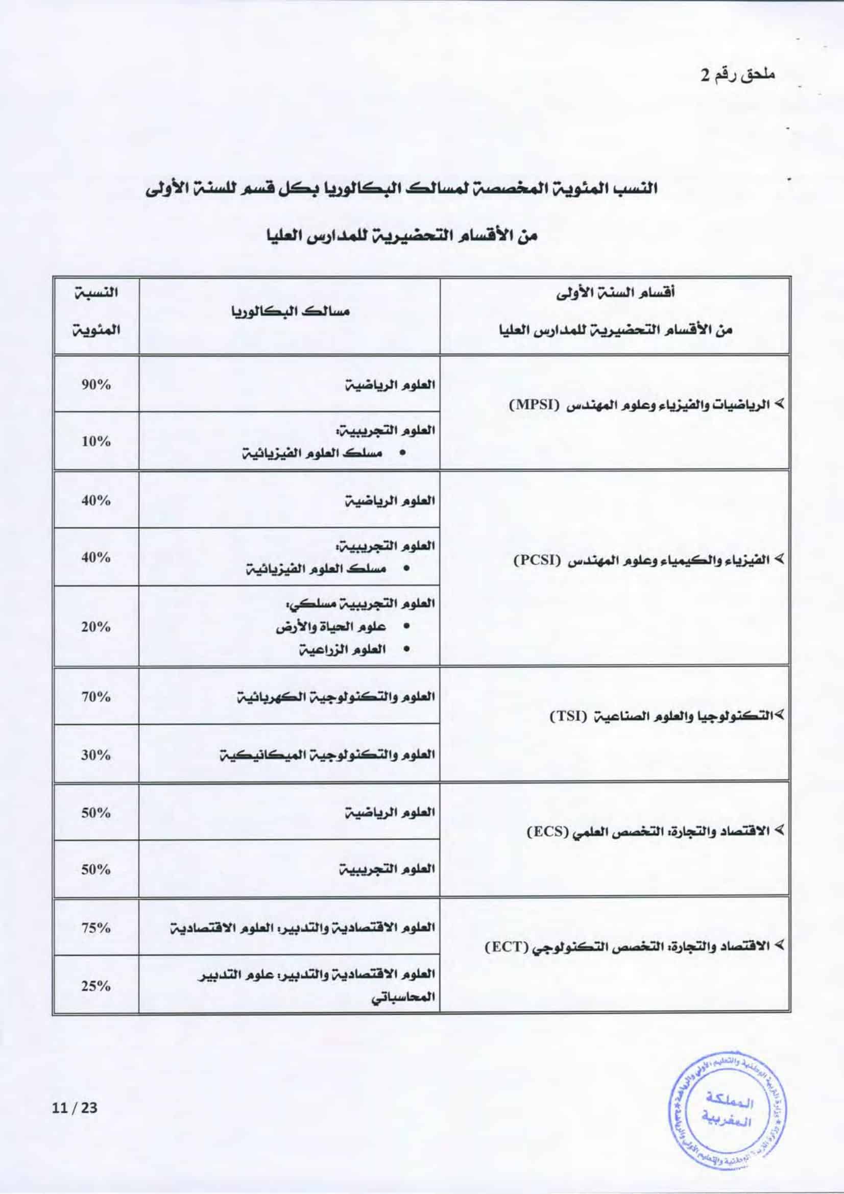 مسالك الأقسام التحضيرية: البكالوريا المطلوبة والنسبة المئوية المخصصة لكل مسلك
