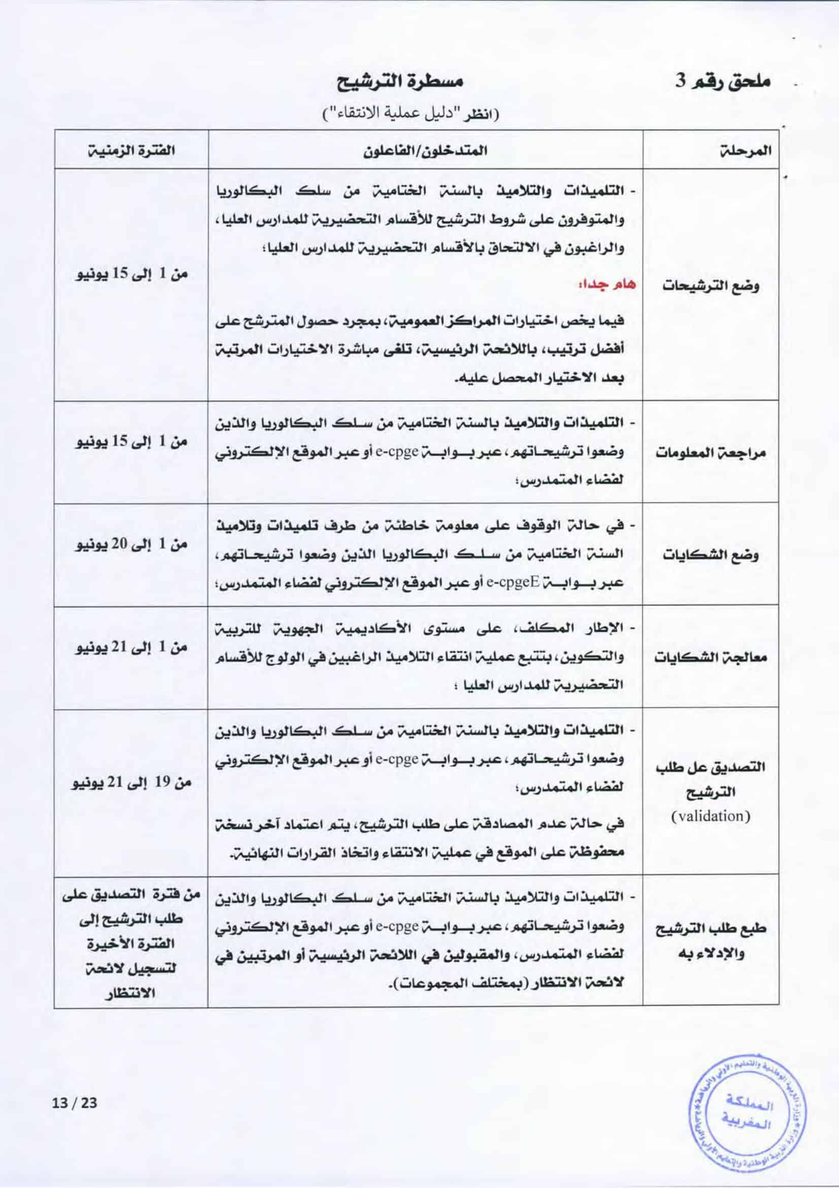 -يتم إجراءات الترشيح والقبول للأقسام التحضيرية للمدارس العليا بالنسبة للمترشحين الذين حصلوا على البكالوريا الوطنية، وفقًا للإجراءات الموضحة في الجدول التالي: