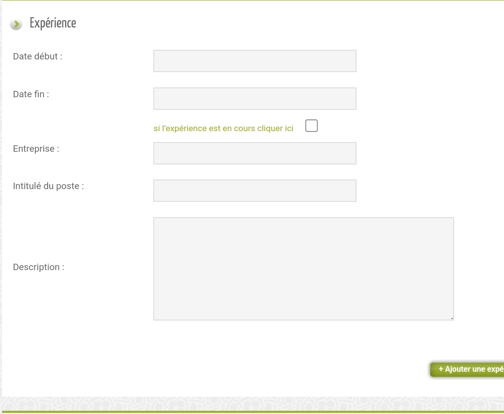 5. خانة معلومات تهم الخبرات والتجارب إن كانت (Expérience).