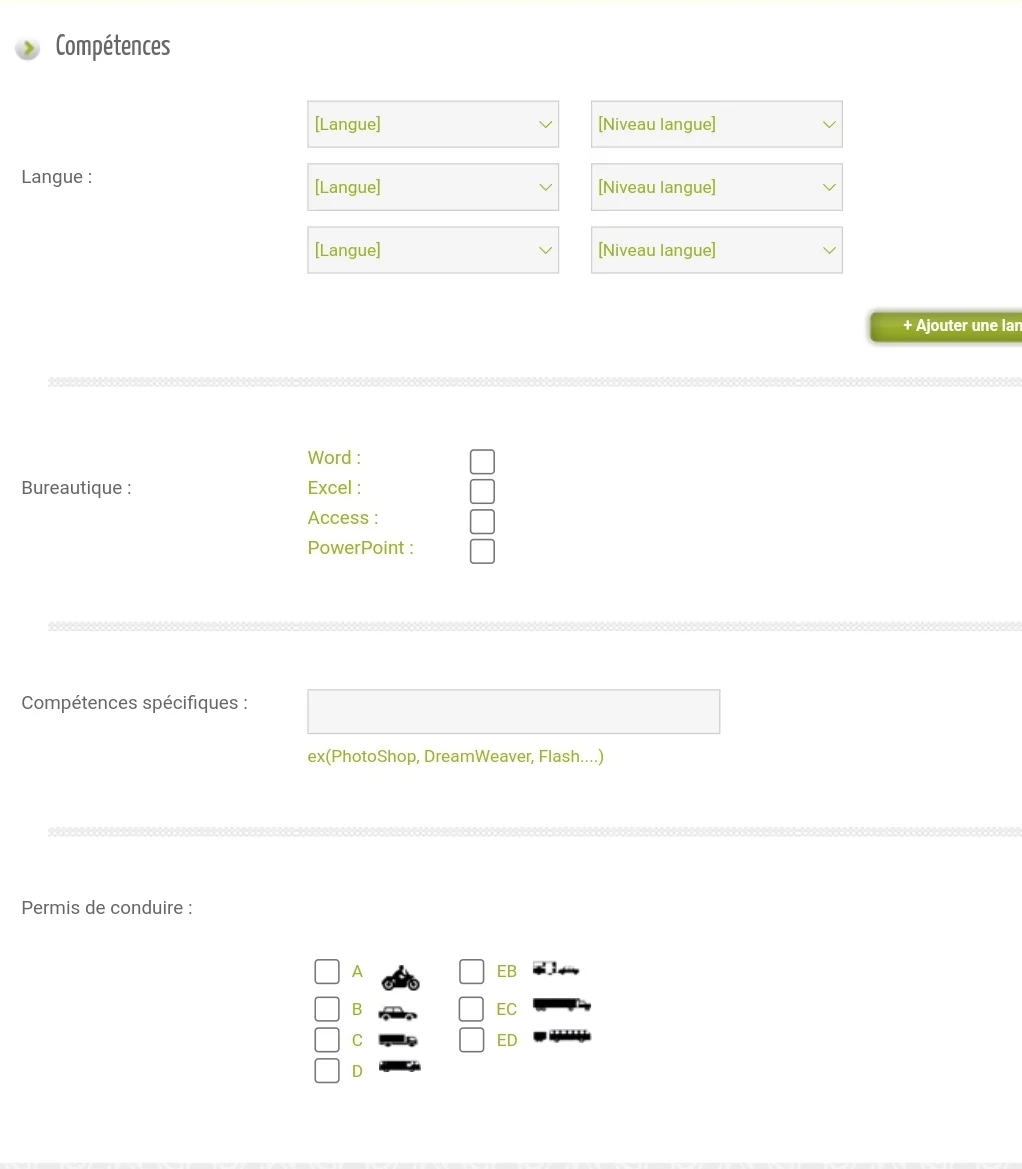 6. ملء خانة معلومات تخص المهارات التي يتوفر عليها كل مرشح Compétences.