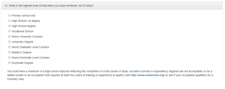 للتقدم على الهجرة العشوائية لأمريكا، يُشترط الحصول على الثانوية العامة أو ما يعادلها، أي أنه يجب أن يكون لديك 12 سنة من التعليم الحكومي.