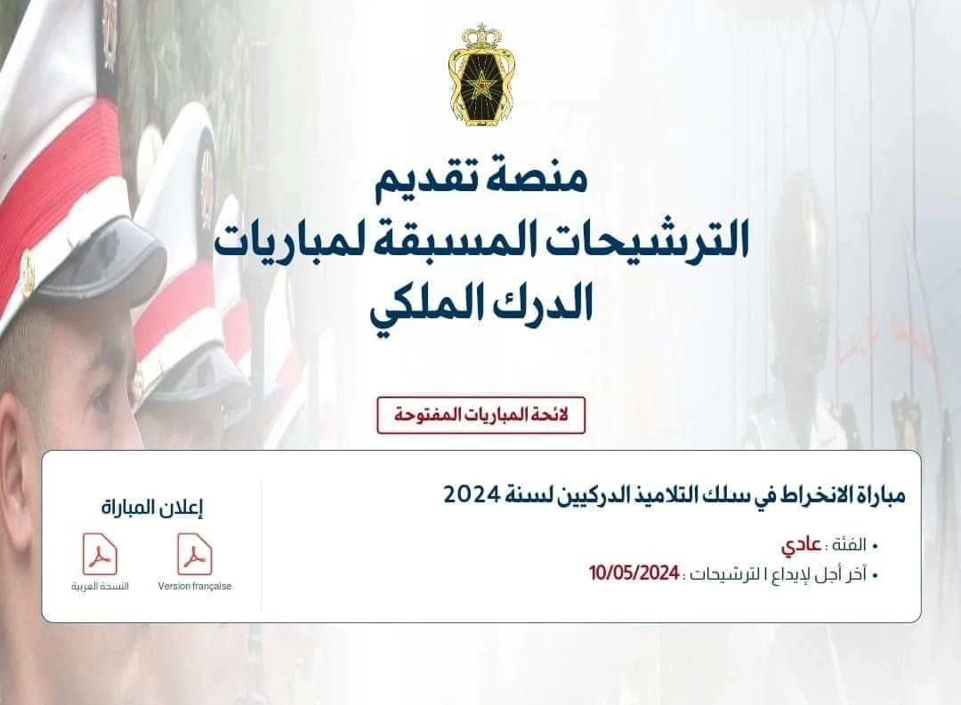 تم بدء إرسال استدعاءات مباراة الدرك الملكي لعام 2024، وهي مفتوحة أمام حملة شهادة الباكالوريا للعامين 2025-2024 في مختلف التخصصات. يتم الانتقاء بناءً على المعدل العام للبكالوريا. تم إرسال الاستدعاء عبر البريد الإلكتروني المُسجل خلال فترة التسجيل.